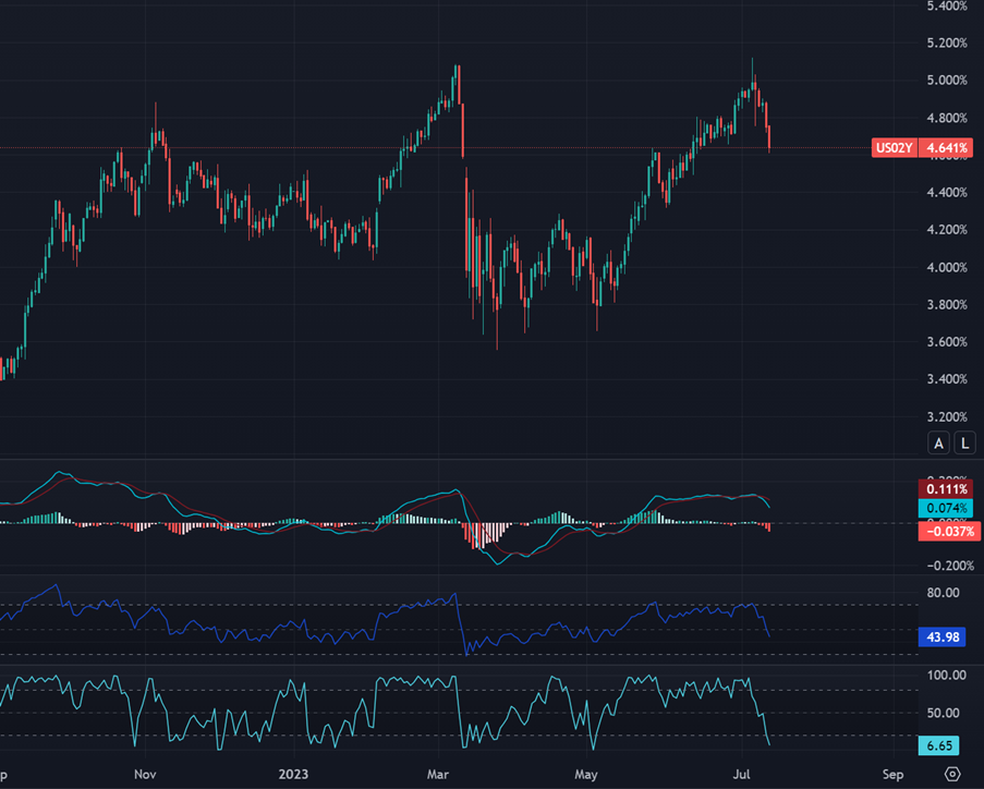 Equities responded positively as CPI grew by just 0.2% monthly in June and only 3% annually The USD weakened against a basket of currencies, and DXY fell by 2.25% Treasury Yields sank on the lower inflation data. Yields fell to 4.64% from 5.1% Last Week, whilst prices rose.
