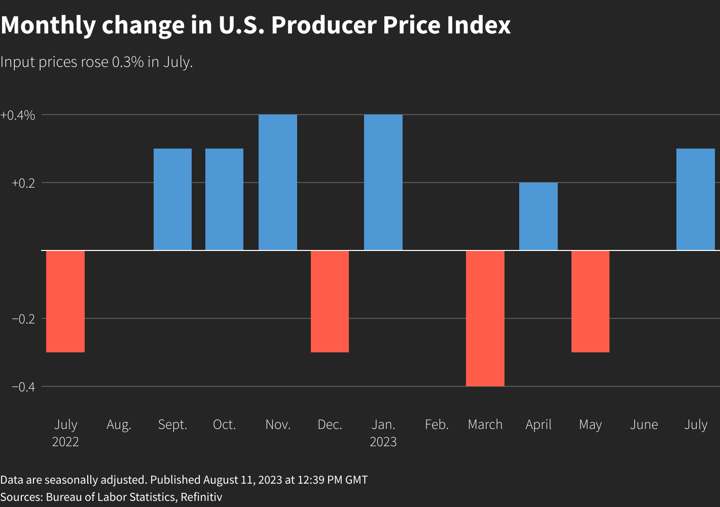US PPI (Producer Price Index) increased 0.3% over July (slightly higher than expected). Consumers continue to spend money, driving up demand, prices of materials and transportation, and therefore product prices which adds to the vicious cycle of inflation. It is still expected that the FED will leave rates alone at the next meeting on 19-20 September. "The economy still faces some inflationary pressure from rapidly rising wages, but the cooldown of business input costs should help keep consumer prices on a downward trajectory in the fall," said Bill Adams, chief economist at Comerica Bank in Dallas.