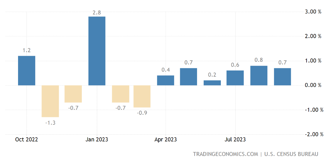 Monthly retail sales increased 0.7% in September (much higher than the 0.3% Dow Jones estimate) and core sales up 0.6%. Sales gains were quite broad across categories, with the largest growth being from miscallaneous store retailers at 3%. This is seen to confirm predictions of 4% GDP growth. This data also gives the FED less reason to loosen their tight monetary policy as the 10 year treasury yield pushes towards 5%. The consensus remains that the FED are done with rate hikes, though this does provide an opposing argument, the next FED decision is on Wednesday 1st November.
