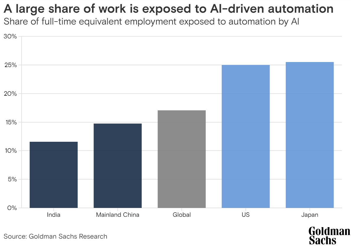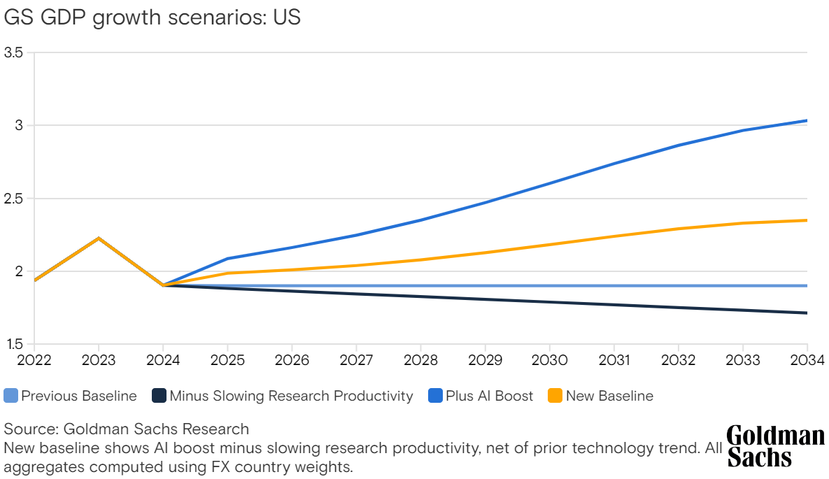 GDP growth beat expectations, rising by an annualised rate of 4.9% in the third quarter of the year. Goods and service spending grew 4.8% and 3.6% respectively.Goldman Sachs recently published an article on Artificial Intelligence, forecasting that it may begn to boost US GDP in 2027; see some interesting figures below...