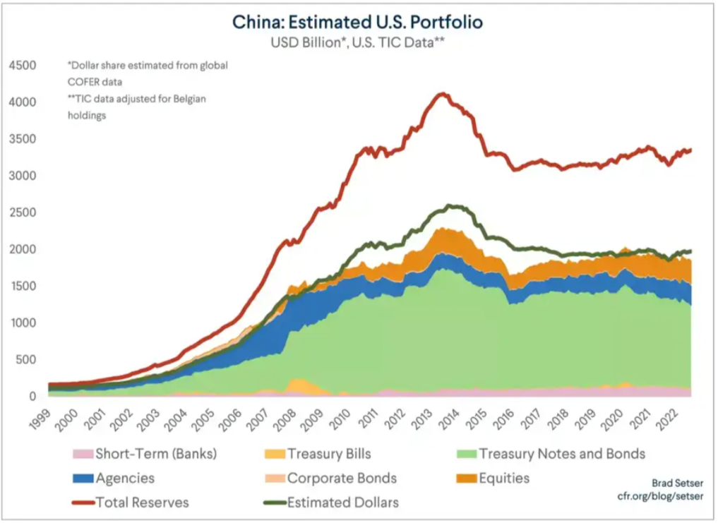 Since March 2020, treasury bonds with maturities of 10 years or more have plummeted 46%.These losses are almost in line with stock market losses seen during the dot com bubble burst and the aftermath of 2008. 10 Year yields have now soared to 4.887% this week. Brad Setser, a former Treasury official wrote recently stating that China are not dumping US bonds, having held a stable portfolio since 2015. The graph below shows their estimated portfolio of US Debt.