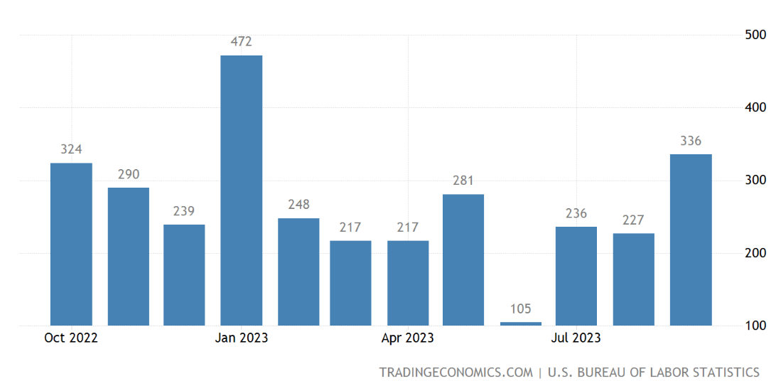 Nonfarm payrolls increased by 336,000 in September, well exceeding expectations of 170,000. This is the stronest job gain in 8 months and should give the FED confidence in keeping interest rates higher for longer.