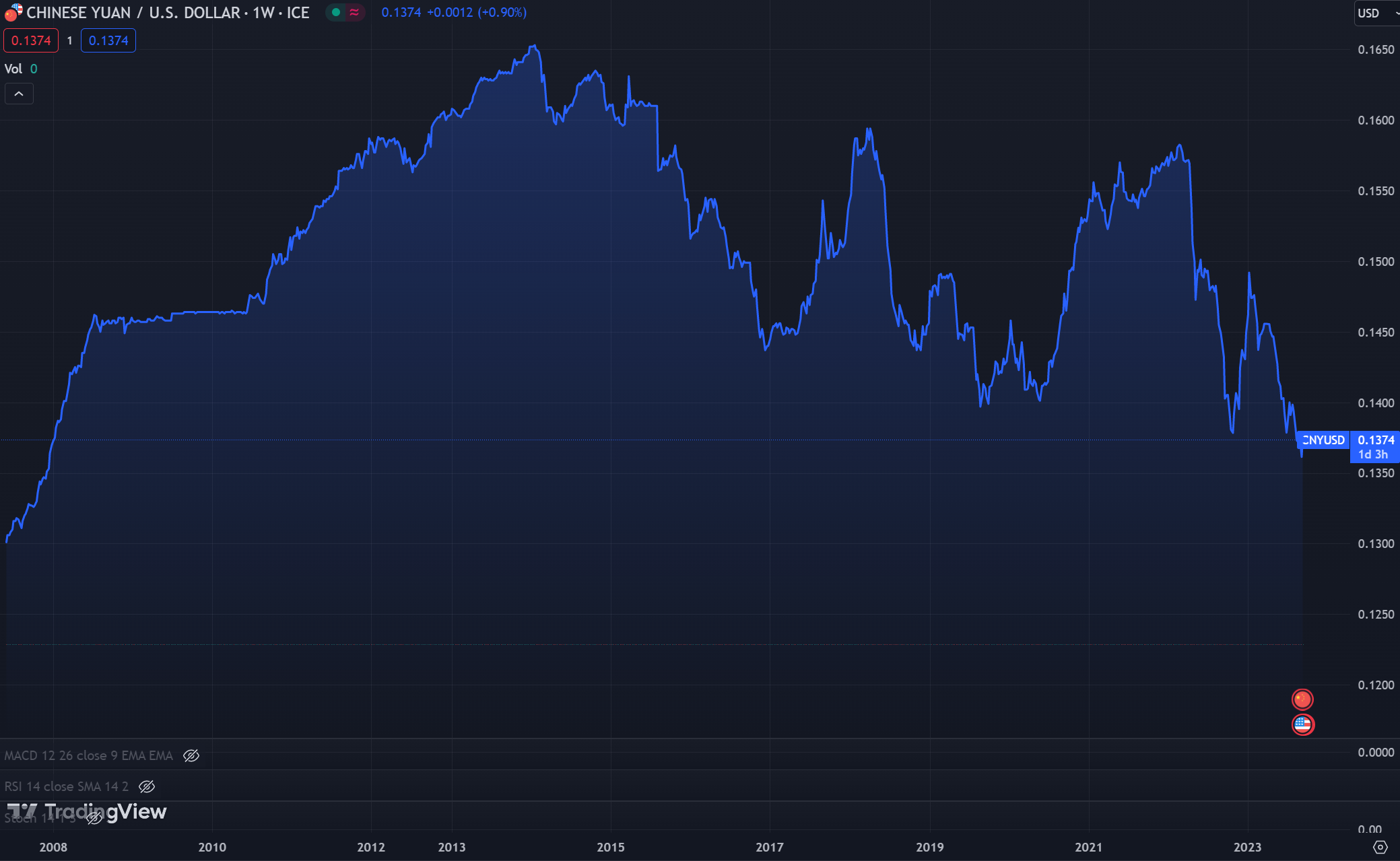 The poor state of the economy and outflows from their stock market has contributed to the weakening of the Chinese Yuan, which has reached its weakest level against the US Dollar since 2007. The SSE index recently hit its lowest level since December last year.