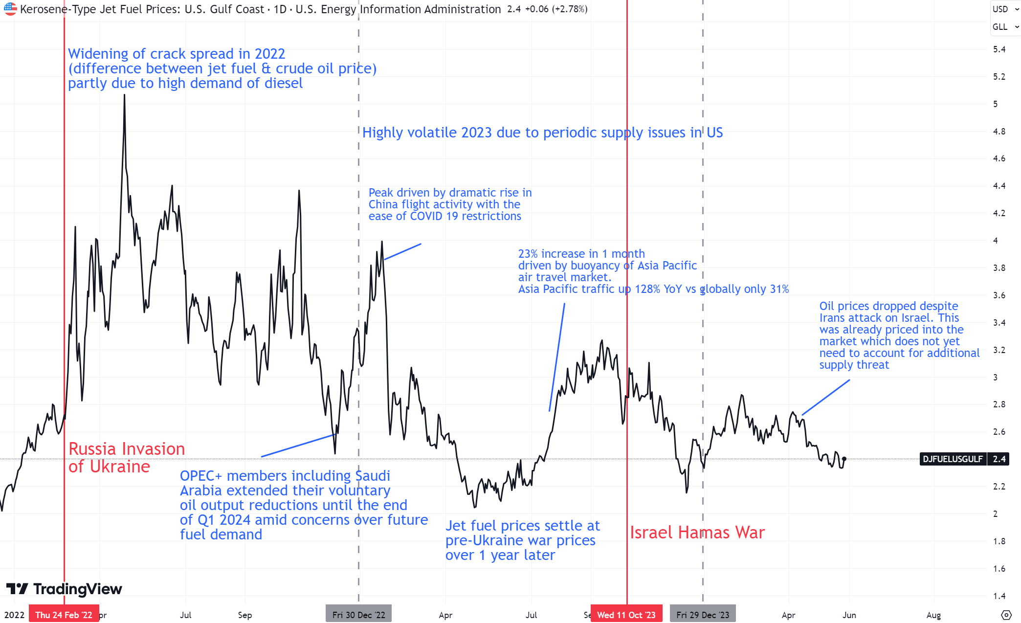Jet fuel is produced from the distillation of crude oil, with the U.S. being the largest producer at a rate of 1500 barrels/day. The chart below shows jet fuel prices since early 2022 with the key causes of movement labelled.